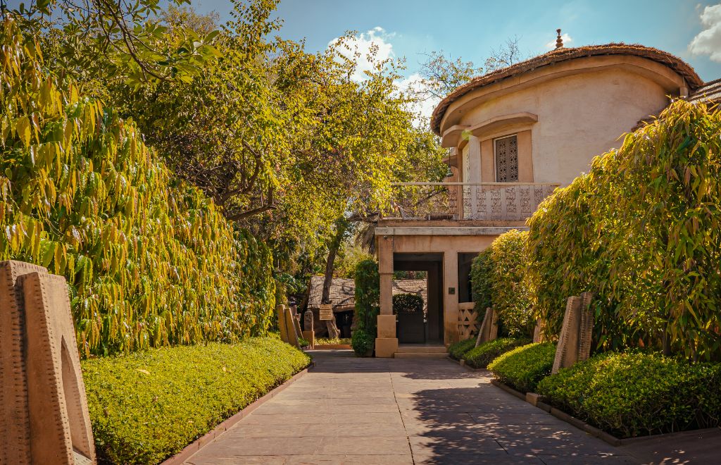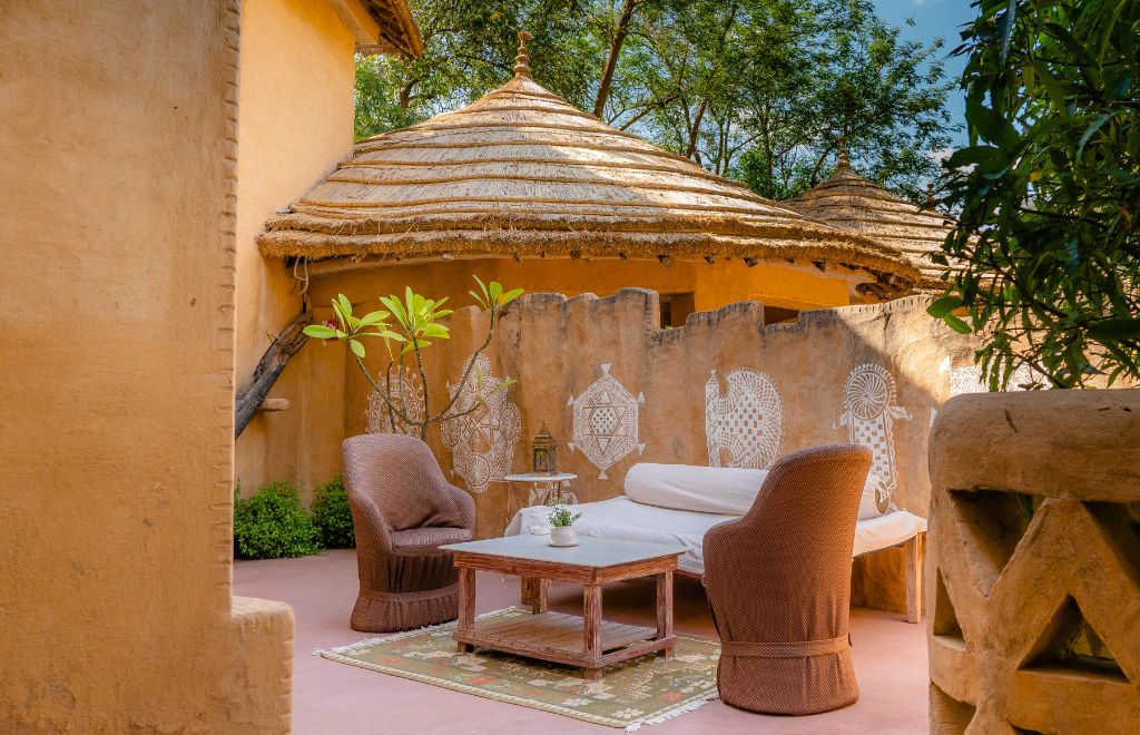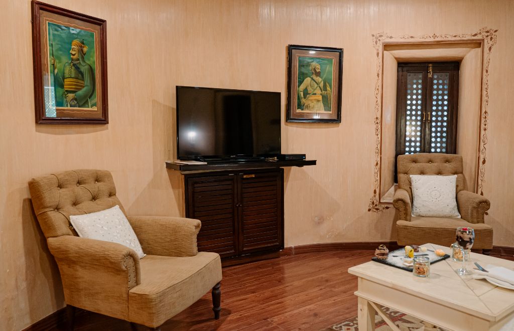 Inspired by the simplistic rural lifestyle in Rajasthan, the façade illustrates rustic hamlets, whilst the walls hark back to Rajputana’s battlefield legacy in the timeless deserts. The décor contains antique military armaments, hand-crafted horse saddle displays, and artwork of battlefield victory and royalty adorn the walls. Each suite has an en-suite bathroom equipped with a stone bathtub and shower, and a private walled balcony.